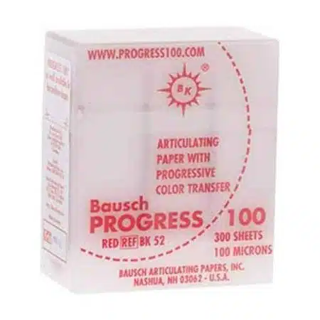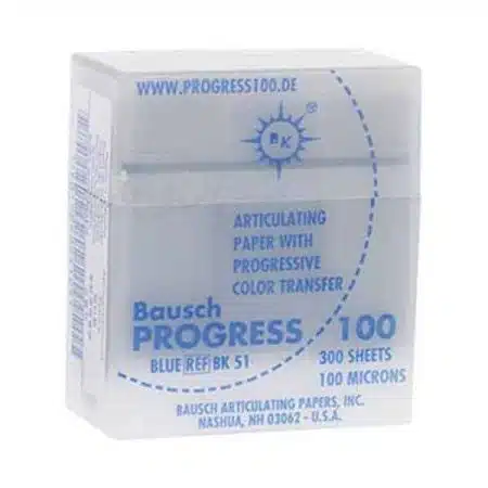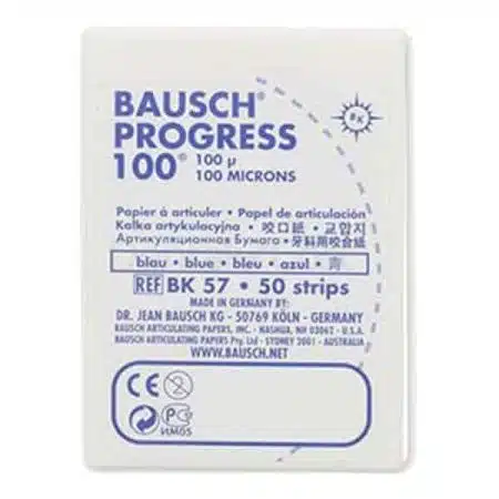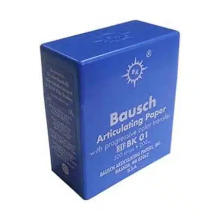 Papel articular BK-81, forma herradura, 40 micras, color azúl / rojo, 150 uds. Indicado especialmente para pacientes que sólo pueden morder unilateralmente durante el control de oclusión. Indispensable en el ajuste de placas de mordida y en el control de oclusión de prótesis totales. Recomendado especialmente en el control de contactos sobre superficies acrílicas impregnadas de saliva. Bausch, Alemania.